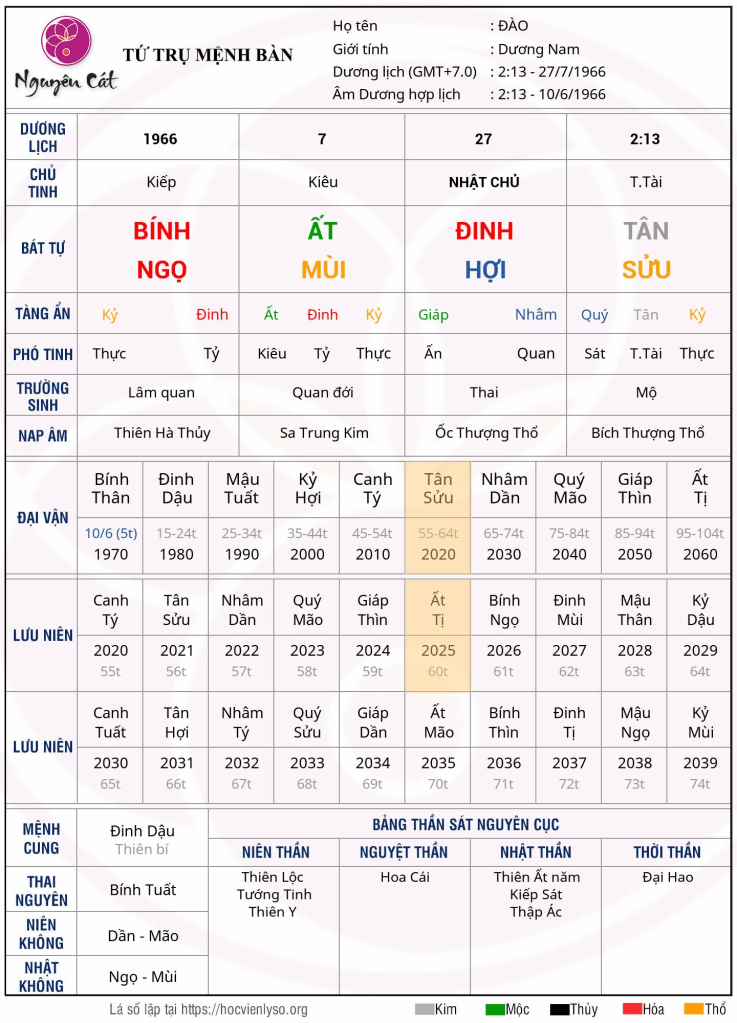 - Đại vận Đinh Dậu: Thiên Tài khá tốt, sớm bước vào con đường mưu sinh, kết hôn cũng sớm.