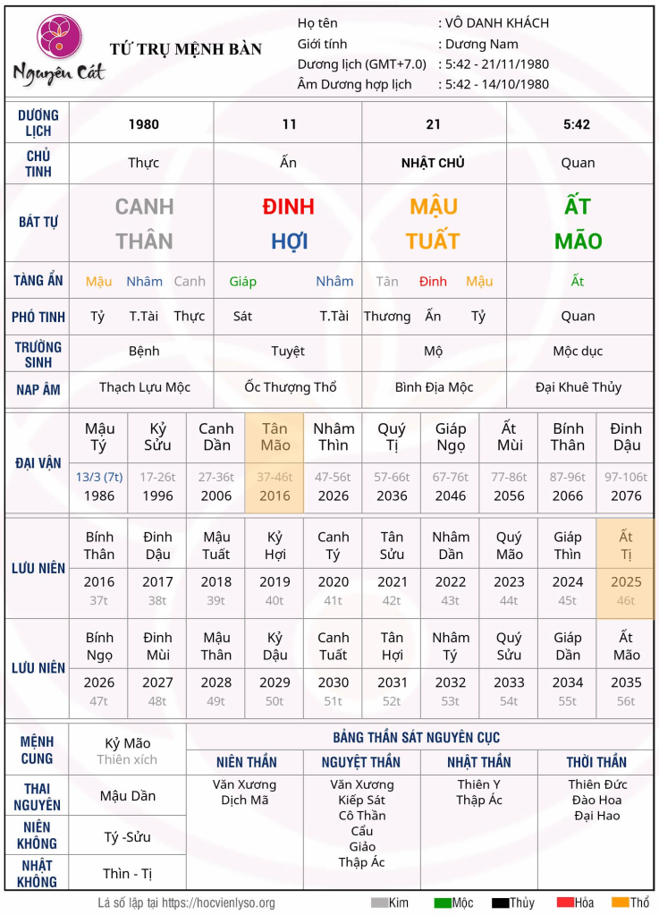 Mệnh này không có Kiếp Tài, làm sao phân biệt đâu là trai đâu là gái. Chỉ có thể dùng tháng trụ làm cung anh chị em để xem. Trong Hợi có Mậu, Giáp, Nhâm; Giáp khắc Mậu, [ám chỉ] khắc anh em, là tượng anh em có thể bị thương tật, tàn phế, yểu vong hoặc nhẹ hơn là mệnh được đem cho người khác nuôi ( Xuất Dưỡng). Mệnh này không có Trường Sinh, Lộc, Nhận, vậy thích hợp dùng câu phán “suy là tuổi lớn, vượng là tuổi nhỏ” để suy mệnh này.