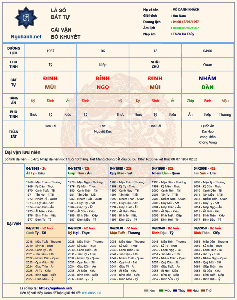 Đại vận Quý Mão, Kỵ thần xuất hiện cả đôi đến khắc thân và khắc Dụng thần, là đại hung. May mắn là có Ất tiềm ẩn giúp tiết khí của Quý để hóa giải Sát, nên được chu toàn. Trong vận này, ông nội qua đời. Thất Sát cũng là công việc và lại là Kỵ thần, đúng lúc có cải cách kinh tế, doanh nghiệp nhà nước chuyển sang tư nhân bao thầu, công việc chính thức bị mất, việc kinh doanh gặp nhiều gian nan, vài năm bị lỗ lớn, phải đóng cửa. Các lưu niên Nhâm Thân, Quý Dậu, sự nghiệp càng thêm bi thảm.
